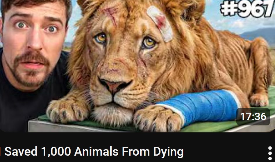 There are two elements of attention-grabbing details present in this thumbnail and title. The first, and one of the most important, is present both in the title and the thumbnail. As you can see above, the title says “I Saved 1,000 Animals From Dying.” Specifically, the number 1,000 is a huge element of these clickbait videos. Often, YouTubers will try to use large, rounded statistics to grab attention and show importance.