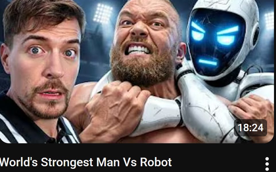 The reason this technically classifies as clickbait is due to the nature of the concept. It is very attention-grabbing and presents an almost ridiculous proposal to the viewer. However, the difference is that the video itself consists entirely of this topic. One of the videos mentioned before was titled “World’s Strongest Man vs. Robot.”